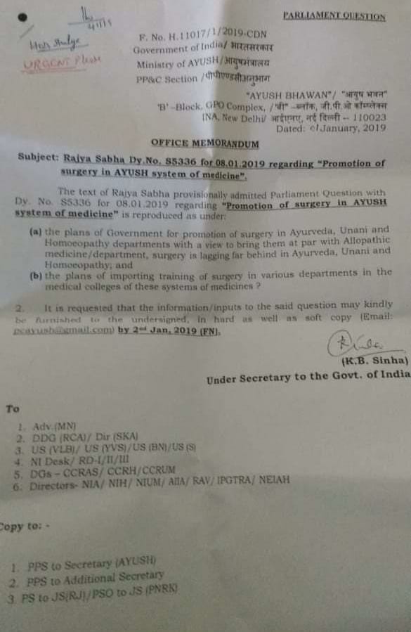 Govt of India to promote Surgery training in Ayurveda Homoeopathy and Unani medical colleges with a view to bring them at par with Allopathic system of medicine by starting surgery training in various departments of Ayush Medical Colleges.