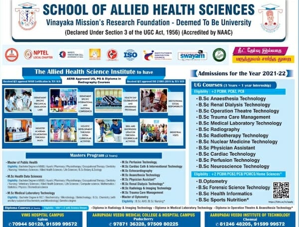 School of allied health sciences under Vinayaka Mission Research Foundation Salem, Tamil Nadu invited application for the Master of Public Health course 2021