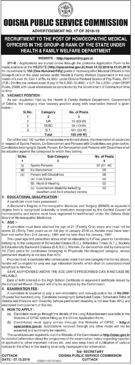 Online applications invited by Odisha Public Service Commission for the post of Homoeopathy Medical Officers