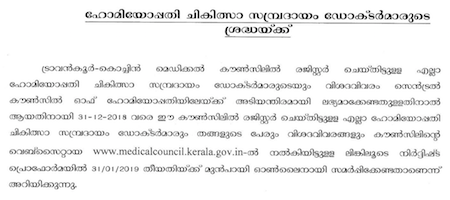 All Homoeopathy doctors registered in Kerala TC Medical Council need to submit their details online before January 31, 2019