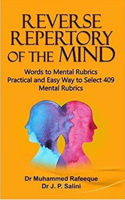 The work by Dr Muhammed Rafeeque and Dr J. P. Salini “Reverse Repertory of the Mind – Words to Mental Rubrics” is a unique work in analysing and decoding the rubrics of mind.