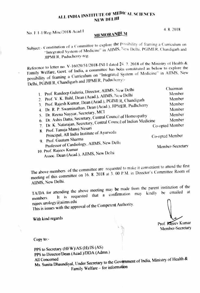 India Govt constituted a committee to explore the possibility of forming a curriculum on “Integrated System of Medicine” in AIIMS New Delhi, PGIMER Chandigarh and JIPMER Puducherry